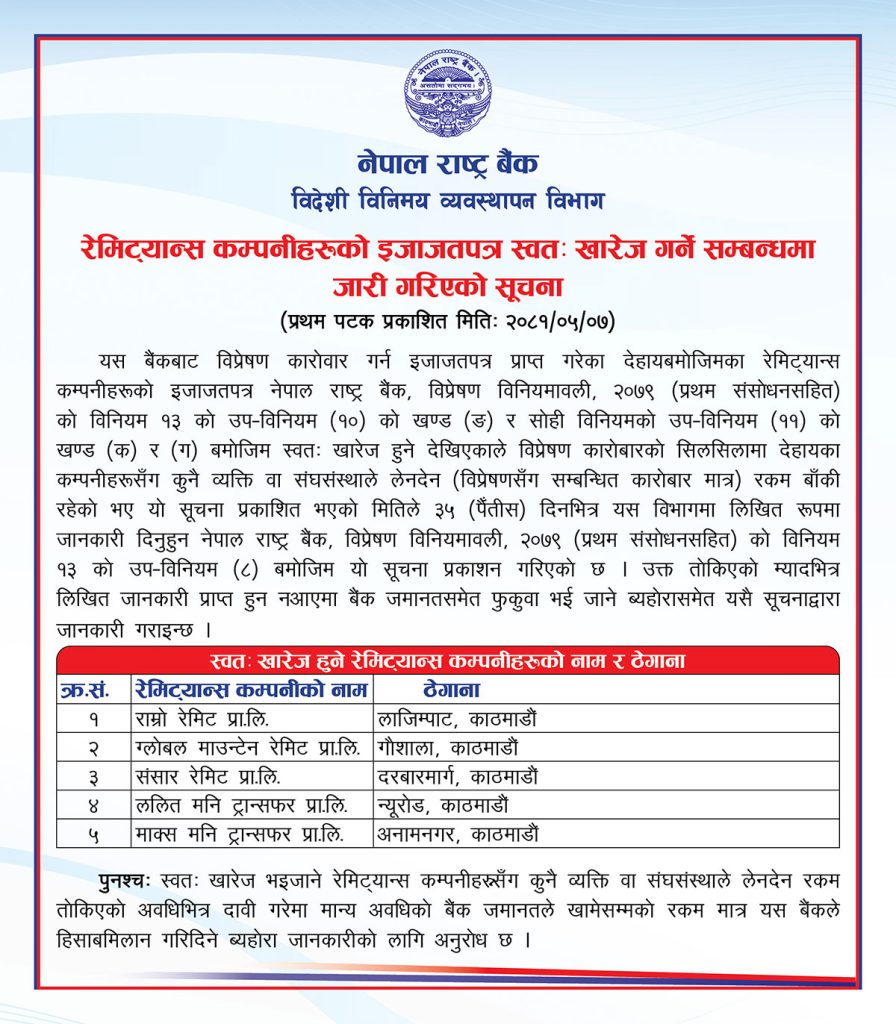 ०९ भदाै, काठमाडौँ । पाँच रेमिट्यान्स कम्पनीको इजाजत पत्र खारेज हुने भएको छ। पाँच कम्पनीको इजाजत पत्र स्वत खारेज हुने देखिएको राष्ट्र बैंकले जनाएको छ।