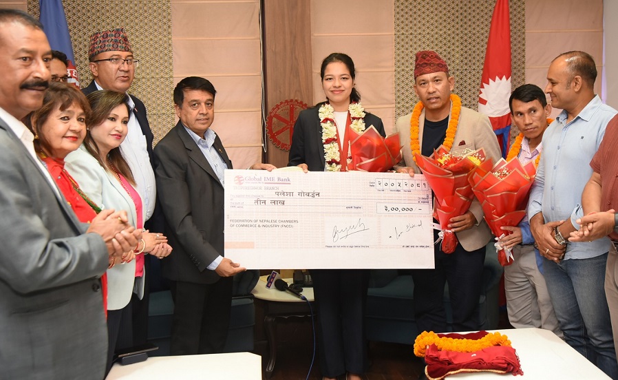 २३ भदाै, काठमाडाैं । नेपाल उद्योग वाणिज्य महासंघले शुक्रबार प्यारालम्पिकमा तेक्वान्दोमा काश्य पदक बिजेता २१ वर्षीय पलेशा गोवद्र्धनलाई सम्मान गरेको छ ।