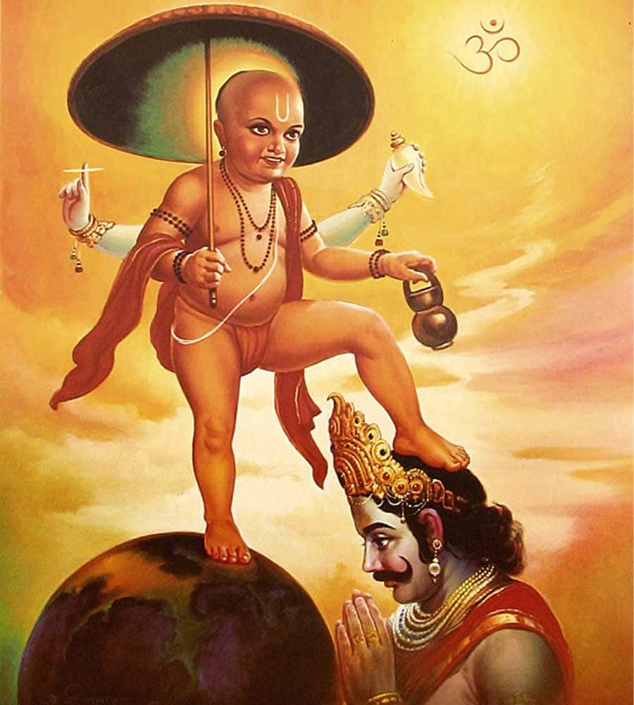 वामनलाई देखेर राजा बलिले आदर वामनलाई देखेर राजा बलिले आदर पूर्वक आफुकहाँ आएको कारण सोधे । तब वामनले बलीलाई आफुले केही दान लिने तर त्यो दिने र नदिने कुरा पहिल्यो वाचा गर्न आग्रह गरे।तब बलिले पनि मागेको चिज दिने वाचा गरे। यसरी वाचा दिलाई सके पछि वामनले हरि भक्ती गरेर बस्नको लागि मात्र ३ पाउ जमिन चाहिएको कुरा व्यक्त गरे।यो सुनेर राजा बलिले अहंकारका साथ भने “म स्वर्गको राजा हुँ मसँग यती सानो चिज माग्नु भयो तैपनि दिन्छु भनेर संकल्प गर्नलागे तब शुक्रचार्यजीले यी वामन सामान्य मानिस नभएर भगवान विष्णू भएको जानकारी दिए र संकल्प गर्नबाट रोक्ने प्रयास गरे।