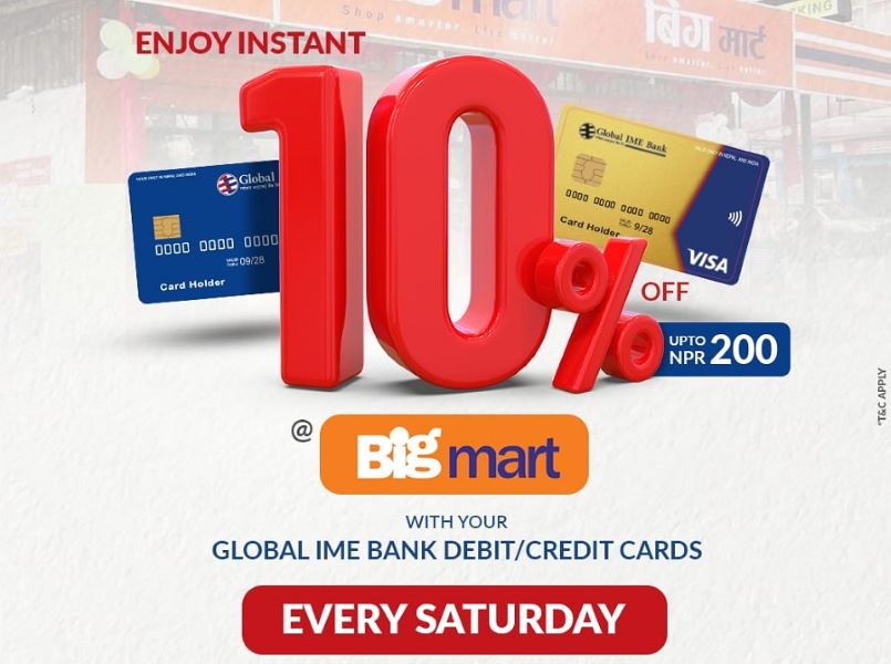 ०६ असाेज, काठमाडाैं । ग्लोबल आइएमई बैंक लिमिटेडले डेबिट तथा क्रेडिट कार्डबाहकहरुलाई प्रत्येक शनिबार बिग मार्टमा आफुलाई आवश्यक सर–समान खरिदपश्चात्को भुक्तानीमा १० प्रतिशत छुट प्रदान गर्ने भएको छ ।