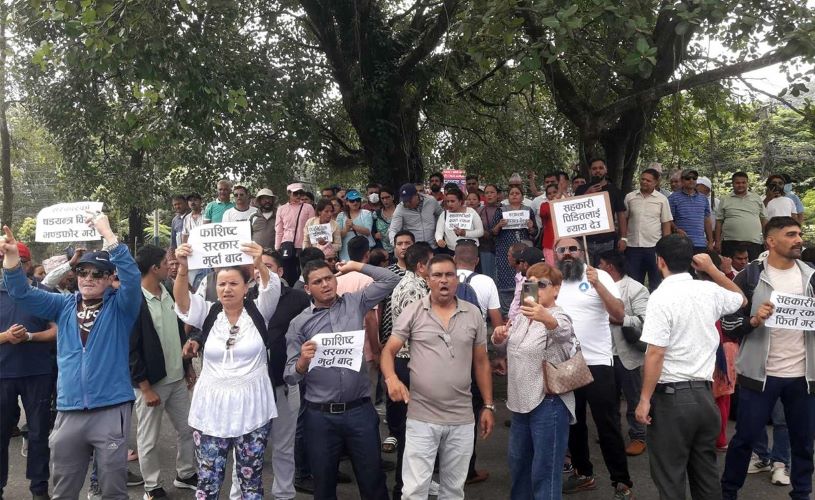 जिल्ला प्रशासन कार्यालयकाे गेटनेर सहकारी पीडित र त्यसकै ठिकअगाडि शहीद चाेककाे चाैतारामा रास्वपाका नेता कार्यकर्ताले नाराबाजी गरिरहेका छन् । पीडितले लामिछानेलाई पक्राउ गर्न माग गरिरहेका छन् भने रास्वपा नेता-कार्यकर्ताले लामिछानेलाई पक्राउ नगर्न चेतावनी दिइरहेका छन् ।