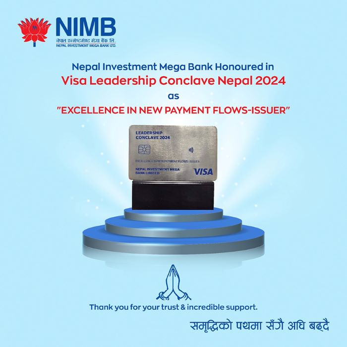 भिसा इन्टरनेसनलले आयोजना गरेको लिडरसिप कन्क्लेभ नेपाल–२०२४ मा नेपाल इन्भेस्टमेन्ट मेगा बैंकले ‘एक्सिलेन्स इन न्यु पेमेन्ट फ्लोज इस्युअर’ अवार्ड पाएको हो ।