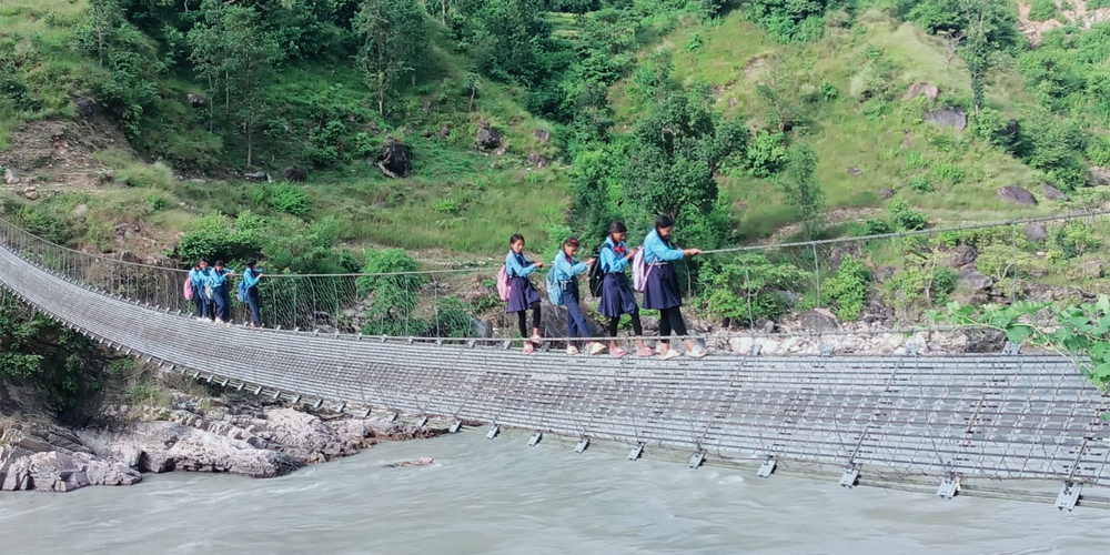 १५ असोज, अछाम । अछामको पञ्चदेवल विनायक नगरपालिका ९ स्थित चण्डिका माध्यमिक विद्यालयका विद्यार्थी छात्राहरु भत्किएको झोलुङ्गे पुलको यात्रा गरेर विद्यालय जान्छन् । गएको जेठ २७ गते पुलको एकतर्फका लठ्ठा चुँडिएर १३ वटा खच्चड फस्दा पुल नै कोल्टे परेको थियो । एकतर्फ कोल्टे परेको झोलुङ्गे पुलबाटै उनीहरु यात्रा गर्ने गर्छन् ।