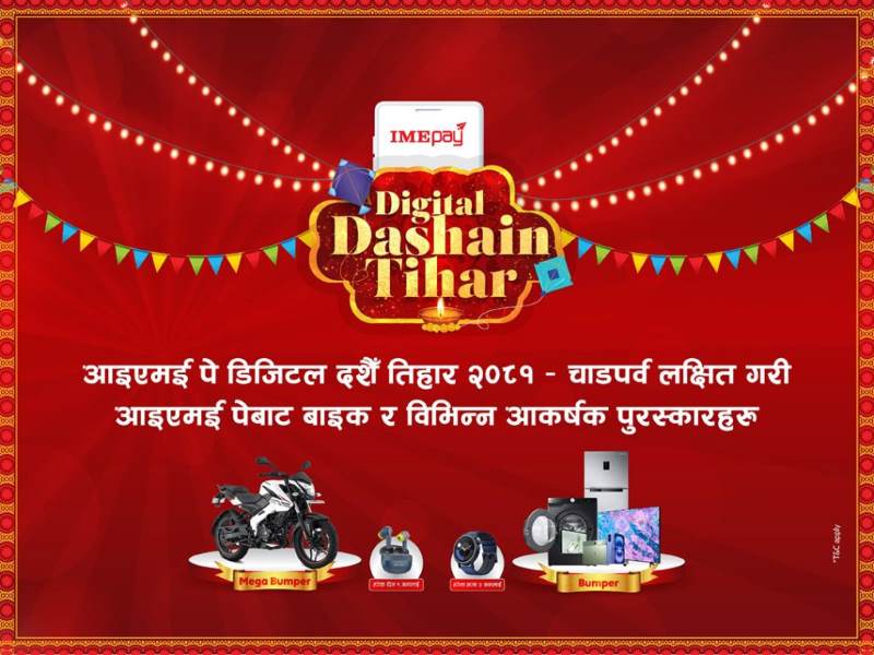 १८ असाेज, काठमाडौं । ‘आईएमई पे’ ले दशैं, तिहार र छठ पर्वलाई लक्षित गरी ‘आइएमई पे डिजिटल दशैं तिहार-२०८१’ योजना सार्वजनिक गरेको छ ।