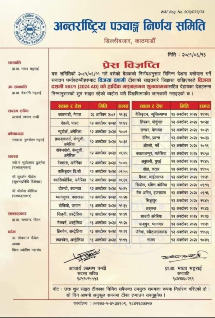 विभिन्न देशमा बसोवास गर्ने सनातन धर्मावलम्बीबाट विजया दशमी टीकाको साइतबारे जिज्ञासा राखिएकाले विजया दशमी २०८१ को शुभसाइत सार्वजनिक गरिएको समितिका सदस्य सचिव लक्ष्मण पन्थीले जानकारी दिए ।