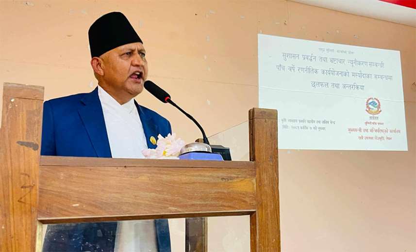 सुशासन प्रवद्र्धन तथा भ्रष्टाचार न्यूनिकरण सम्वन्धी पाँच बर्षे रणनीतिक कार्ययोजनाको मस्यौदा सम्वन्धि छलफल तथा अन्तरक्रिया कार्यक्रमलाई बाँकेमा सम्वोधन गर्दै मुख्यमन्त्री आचार्यले भ्रष्टाचार नियन्त्रण सम्वन्धि पाँच बर्षे रणनीतिक योजनालाई कडाई पूर्वक कार्यान्वयन गरिने समेत बताए।
