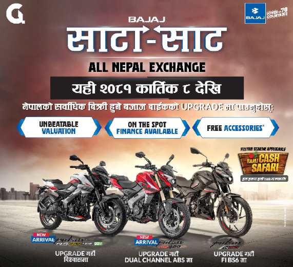 ०९ कार्तिक, काठमाडौं। नेपालका लागि बजाज मोटरसाइकलको आधिकारिक वितरक एवं बिक्रेता हंसराज हुलास चन्द एण्ड कम्पनीले मोटरसाईकल साटा–साटको आकर्षक योजना शुरू गरेको छ । यस योजना अन्तर्गत जुन सुकै मोडल र जुनसुकै ब्राण्डको मोटरसाइकलसँग बजाजका जुनसुकै मोडलका मोटरसाईकल साटा–साट गर्न सकिन्छ ।