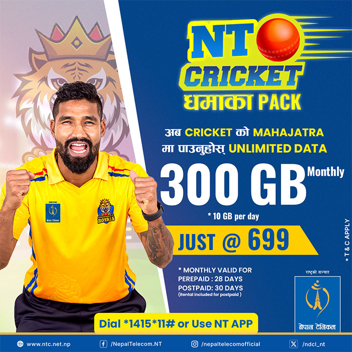 १५ मंसिर, काठमाडौँ । नेपाल टेलिकमले नेपाल प्रिमियर लिग (एनपीएल) २०८१ लाई लक्षित गर्दै क्रिकेटप्रेमी दर्शकहरूको सुविधाका लागि एनटी क्रिकेट धमाका प्याक सार्वजनिक गरेको छ। लाजिम्पाटस्थित होटल ¥याडिसनमा सुदूरपश्चिम रोयल्स टिमसँगको भेटघाट कार्यक्रममा नेपाल टेलिकमका प्रबन्ध निर्देशक संगीता पहाडी अर्याल र सुदूरपश्चिम रोयल्सका प्रमुख स्वतन्त्र प्रताप शाहले संयुक्त रुपमा यो योजना शुभारम्भ गरेका हुन्।