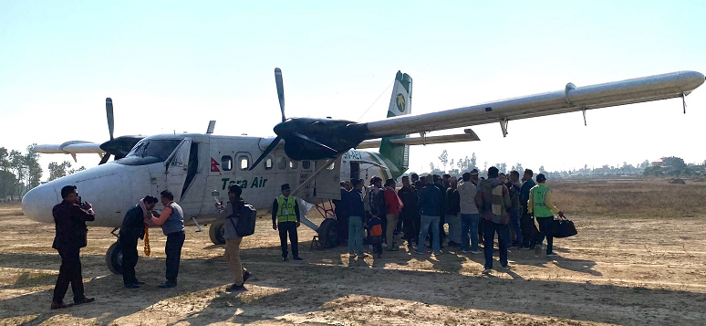 ३० मंसिर, काठमाडाैं । सत्ताइस वर्र्षदेखि बन्द अवस्थामा रहेको कैलालीको टीकापुर विमानस्थल नियमित सञ्चालनमा आएको छ । आज तारा एयरको वाइटी १७०१ नम्बरको ट्वीनअटर विमानमा चालक दलका तीनसहित छ कर्मचारी र १२ यात्रु बोकेको विमान दिउँसो १ः४४ बजे टीकापुर विमानस्थलमा अवतरण गरेसँगै विमानस्थलमा नियमित हवाई उडान सुरू भएको हो ।