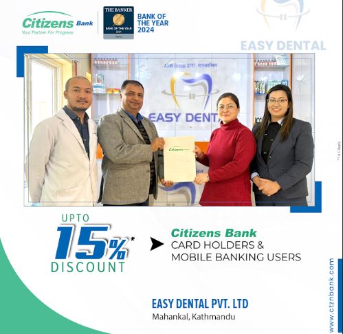 सो समझदारीपत्रमा हस्ताक्षर पश्चात् सिटिजन्स बैंकका कार्ड बाहक र मोबाइल बैंकिङ्ग ग्राहकहरूले इजी डेन्टल प्रा. लि.मा १५% सम्मको आकर्षक छुट पाउने छन् । यस किसिमको सहकार्यबाट बैंकका ग्राहकहरु लाभान्वित हुनुका साथै नगद कारोबार बाट डिजिटल कारोबार तर्फ उत्प्रेरित हुने विश्वास बैंकले लिएको छ ।
