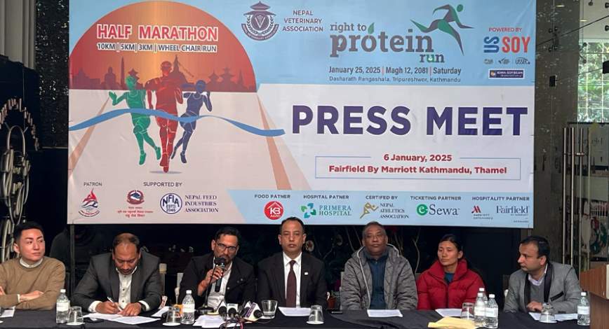 २२ पुस, काठमाडौं । नेपाल भेटेरिनरी एसोसिएसनको आयोजनामा चाैथो राईट टु प्रोटिन रन हाफ म्याराथन आगामी माघ १२ गते हुने भएको छ । आयोजकले सोमबार राजधानीमा पत्रकार सम्मेलन गर्दै प्रतियोगिताबारे जानकारी दिएको हो ।