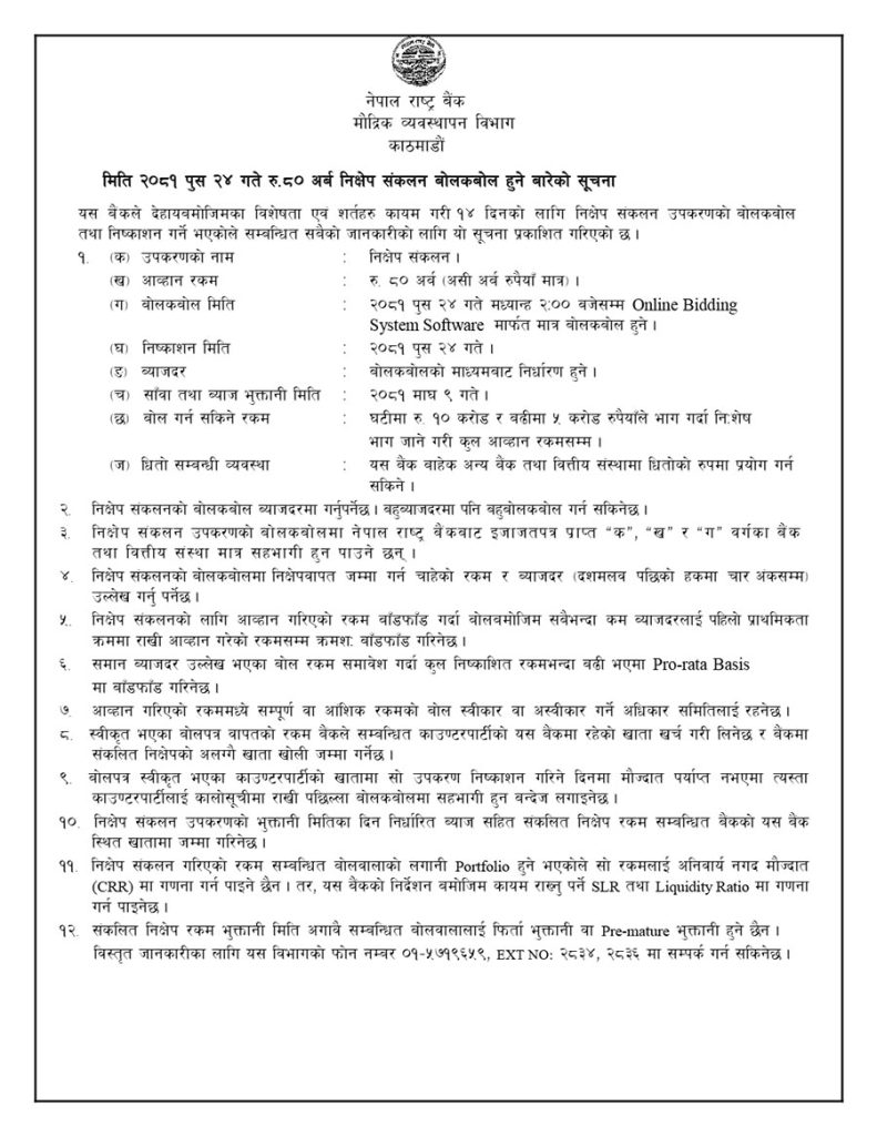 निक्षेप संकलनको बोलकबोल ब्याजदरमा गर्नुपर्नेछ भने बहुब्याजदरमा पनि बहुबोलकबोल गर्न सकिने राष्ट्र बैंकले जनाएको छ। निक्षेप संकलन उपकरणको बोलकबोलमा ‘क’, ‘ख’ र ‘ग’ वर्गका बैंक तथा वित्तीय संस्थामात्र सहभागी हुन पाउनेछन्। यो १४ दिने निक्षेप संकलन उपकरणको माघ ९ गते साँवा तथा ब्याज भुक्तानी गरिने राष्ट्र बैंकले जनाएको छ।
