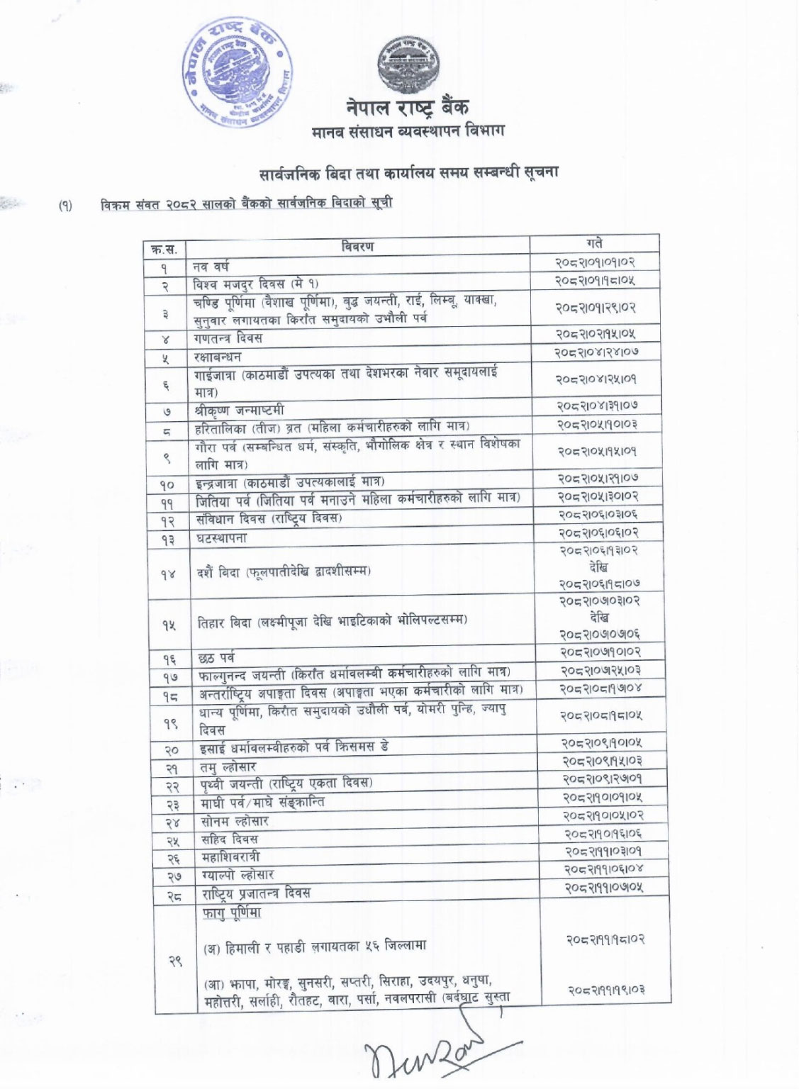 नेपाल राष्ट्र बैंकले सार्वजनिक गरेको बैंक तथा वित्तीय संस्थाहरूको बिदा सूचीमा यस्तो उल्लेख छ । जसमा ३२ दिन बाहेक अन्य ६ दिन सरकारले बिदा दिने निर्णय गरेको हकमा मात्रै लागू हुनेछ ।