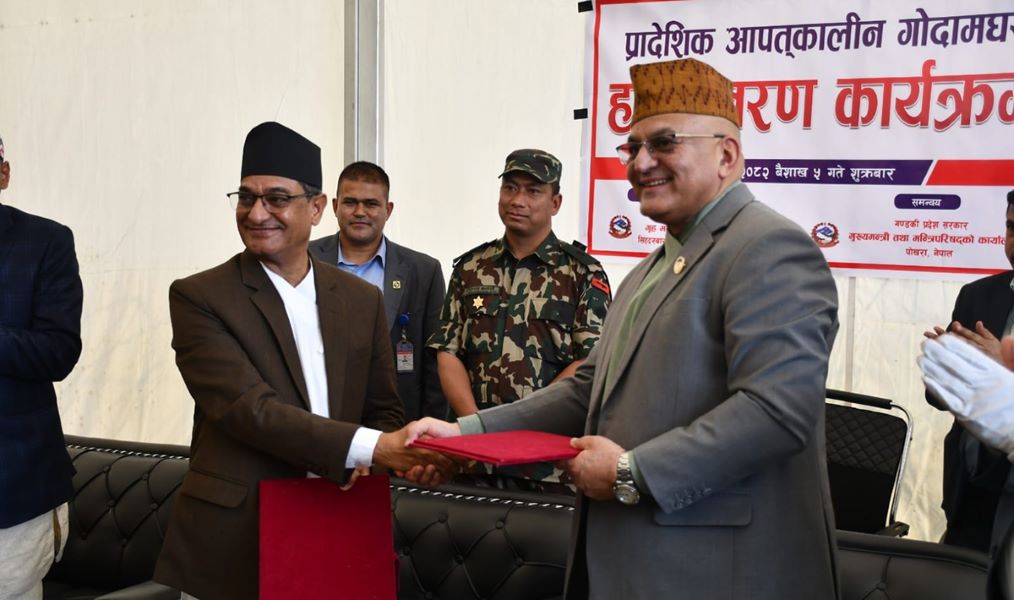 ०५ वैशाख, काठमाडौं । विपद्जन्य घटनाहरू भएमा तत्काल उद्दार तथा राहत सामग्री राखने प्रादेशिक आपतकालीन गोदामघर प्रदेश हस्तान्तरण गरिएको छ। शुक्रबार एक कार्यक्रमका बीच गृहमन्त्री रमेश लेखकले उक्त गोदामघर गण्डकी प्रदेशका मुख्यमन्त्री सुरेन्द्रराज पाण्डेलाई हस्तान्तरण गरेका हुन्।