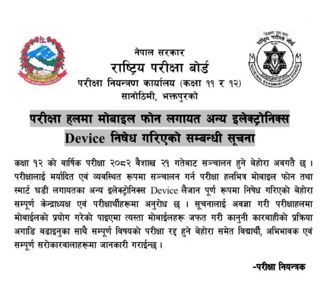 हिजाे एक सूचना जारी गर्दै बोर्डले परीक्षा केन्द्रभित्र मोबाइल वा अन्य डिजिटल डिभाइस प्रयोग गरिएको पाइए सम्बन्धित विद्यार्थीको सम्पूर्ण परीक्षा रद्द हुने चेतावनी दिएको छ ।