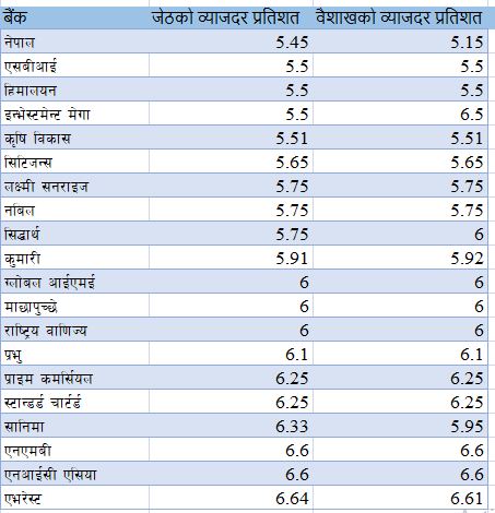 जेठ महिनामा २० वाणिज्य बैंकहरुमध्ये तीन वटा बैंकहरुले ब्याजदर बढाउँदा अरु तीन वटा बैंकले घटाएका छन् । १४ बैंकले भने बैशाख महिनाकै ब्याजदरलाई निरन्तरता दिएका छन् ।