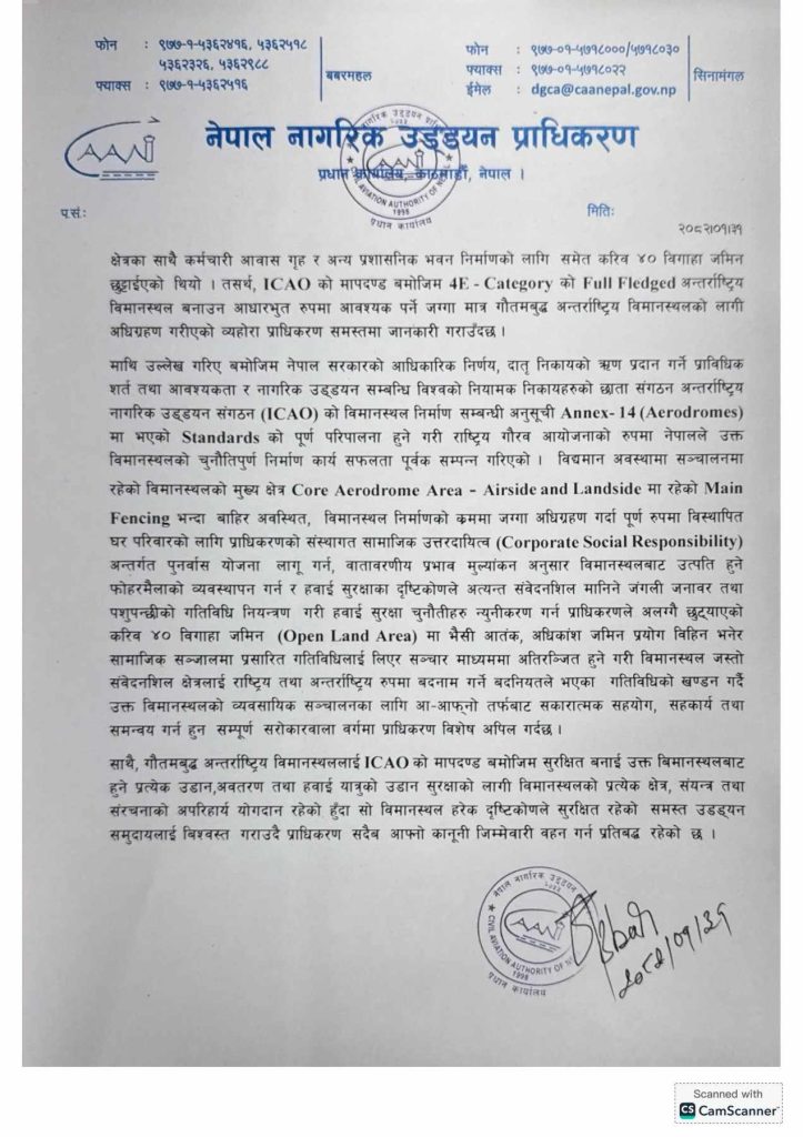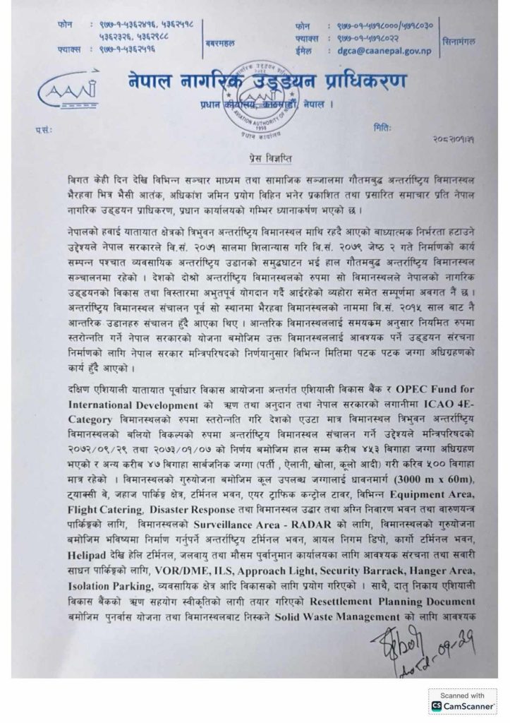‘विद्यमान अवस्थामा सञ्चालनमा रहेको विमानस्थलको मुख्य क्षेत्र Core Aerodrome Area – Airside and Landside मा रहेको Main Fencing भन्दा बाहिर अवस्थित, विमानस्थल निर्माणको क्रममा जग्गा अधिग्रहण गर्दा पूर्ण रुपमा विस्थापित घर परिवारको लागि प्राधिकरणको संस्थागत सामाजिक उत्तरदायित्व (Corporate Social Responsibility) अन्तर्गत पुनर्वास योजना लागू गर्न, वातावरणीय प्रभाव मुल्यांकन अनुसार विमानस्थलबाट उत्पति हुने फोहरमैलाको व्यवस्थापन गर्न र हवाई सुरक्षाका दृष्टिकोणले अत्यन्त संवेदनशिल मानिने जंगली जनावर तथा पशुपन्छीको गतिविधि नियन्त्रण गरी हवाई सुरक्षा चुनौतीहरु न्युनीकरण गर्न प्राधिकरणले अलग्गै छुट्याएको करिव ४० विगाहा जमिन (Open Land Area) मा भैसी आतंक, अधिकांश जमिन प्रयोग विहिन भनेर सामाजिक सञ्जालमा प्रसारित गतिविधिलाई लिएर सञ्चार माध्यममा अतिरञ्जित हुने गरी विमानस्थल जस्तो संवेदनशिल क्षेत्रलाई राष्ट्रिय तथा अन्तर्राष्ट्रिय रुपमा बदनाम गर्ने बदनियतले भएका गतिविधिको खण्डन गर्दै उक्त विमानस्थलको व्यवसायिक सञ्चालनका लागि आ-आफ्नो तर्फबाट सकारात्मक सहयोग, सहकार्य तथा समन्वय गर्न हुन सम्पूर्ण सरोकारवाला वर्गमा प्राधिकरण विशेष अपिल गर्दछ ।’