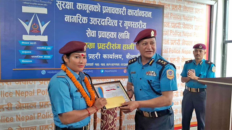 जिल्ला प्रहरी कार्यालय कैलालीले बुधबार प्रहरी जवान चन्द्रिका देउवालाई प्रसंशा पत्र र रेकर्डमा जानेगरी पुरस्कृत गरेको हो । कैलालीका प्रमुख प्रहरी उपरीक्षक(एसपी) बाल नरसिंह राणाले देउवालाई प्रशंसा पत्रसहित पुरस्कृत गरेमा हुन् ।