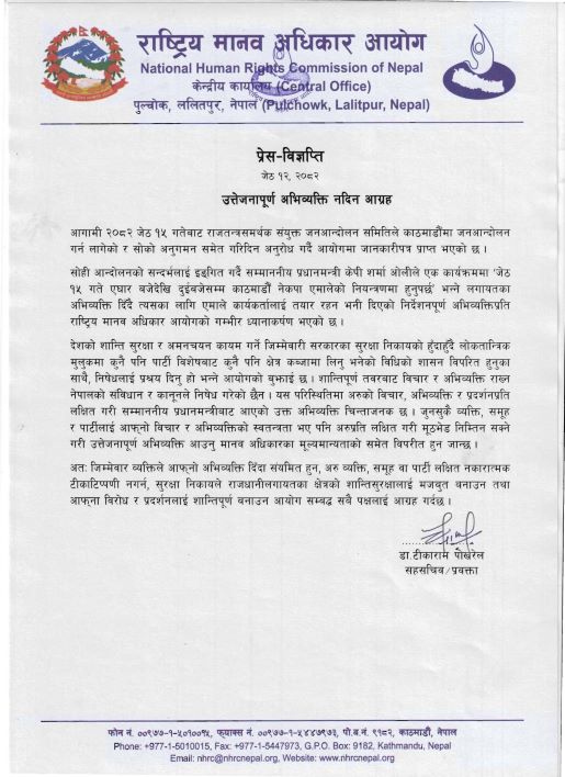 शान्तिपूर्ण तवरबाट विचार र अभिव्यक्ति राख्न नेपालको संविधान र कानुनले निषेध नगरेको आयोगले स्मरण गराएको छ ।