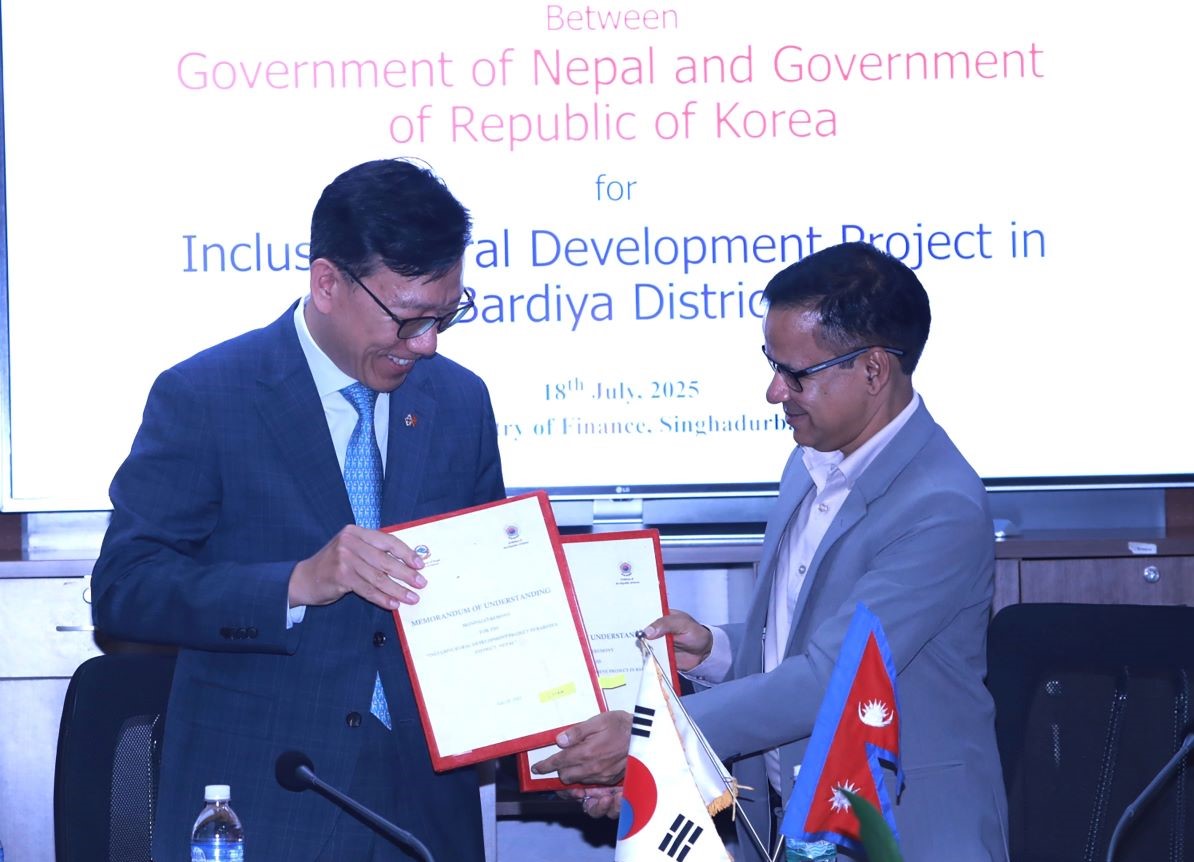 ०२ साउन, काठमाडौं। नेपाल सरकार र कोरियाली सरकारबीच बर्दिया जिल्लामा समावेशी ग्रामीण विकास परियोजना (आइआरडिपी) कार्यान्वयनका लागि सम्झौतापत्र (एमओयु) मा हस्ताक्षर भएको छ ।