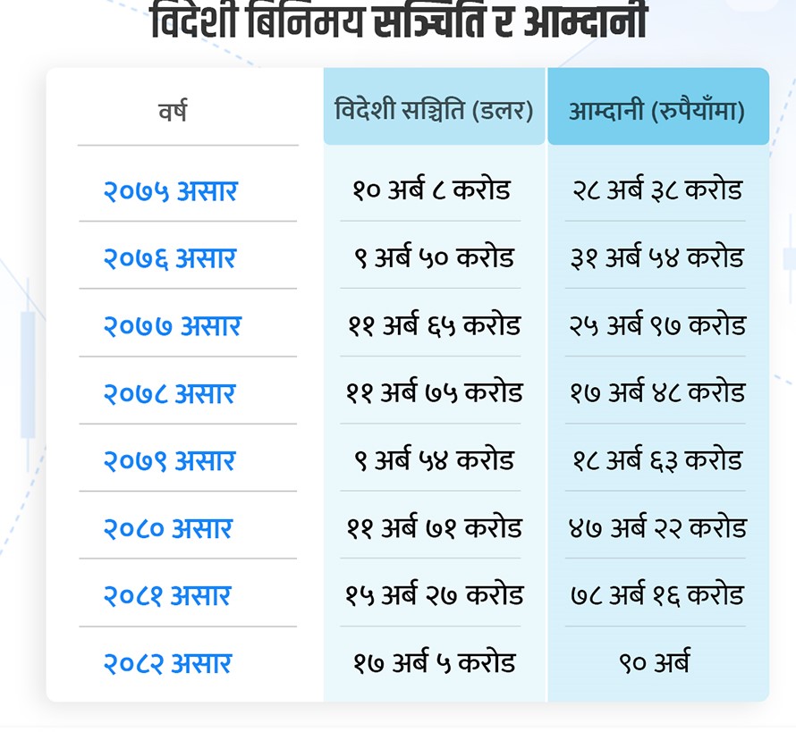 २०८२ असार मसान्तसम्म राष्ट्र बैंकसँग १७ अर्ब ५ करोड अमेरिकी डलर बराबर विदेशी विनिमय सञ्चिति थियो । त्यसैगरी २०८१ असार मसान्तमा यस्तो सञ्चिति १५ अर्ब २७ करोड अमेरिकी डलर थियो ।