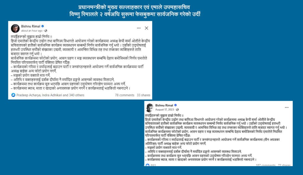 यता निर्णयको चर्को आलोचना भएपछि प्रधानमन्त्रीको मुख्य सल्लाहकार समेत रहुन भएको एमाले उपमहासचिव विष्णु रिमालले आफ्नो फेसबुक मार्फत जारी गरेको उर्दीमा पनि अध्यक्ष बाहेकको कसैको फोटो नराख्ने भन्ने निर्णयमा तीन नेताको बाहेक भनेर फेसबुकको पोष्टमै संशोधन राख्नुभयो ।