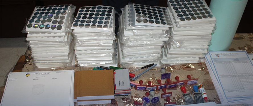 यसका साथै उत्तर प्रदेशमा रहेको अमिति युनिभर्सिटीको मार्कसिट ८० वटा, प्रोभिजनल सर्टिफिकेट ४० वटा, क्यारेक्टर सिर्टिफिकेट ६० वटा, ब्ल्यांक सर्टिफिकेट ४९ वटा र ब्ल्यांक लोगो ४० वटा प्रहरीले बरामद गरेको छ ।