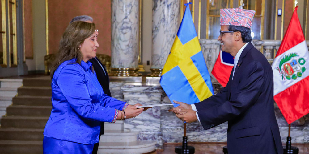 ०६ भदाै, काठमाडौँ । ब्राजिलका लागि नेपालका राजदूत निर्मलराज काफ्लेले आज पेरुका राष्ट्रपति दिना एर्सिलिया बोलुआर्टे जेगारासमक्ष नेपालका गैरआवासीय राजदूतका रूपमा आफ्नो ओहोदाको प्रमाणपत्र प्रस्तुत गर्नुभएको छ ।