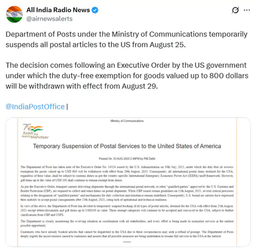 ०७ भदाै, नयाँदिल्ली । भारतीय हुलाक विभागले सोमबार अगस्ट २५ देखि अमेरिकाका लागि धेरैजसो हुलाक वस्तुहरूको बुकिङ निलम्बन गर्ने भएको छ । हाल यो निर्णय अस्थायी रूपमा लागू हुनेछ।