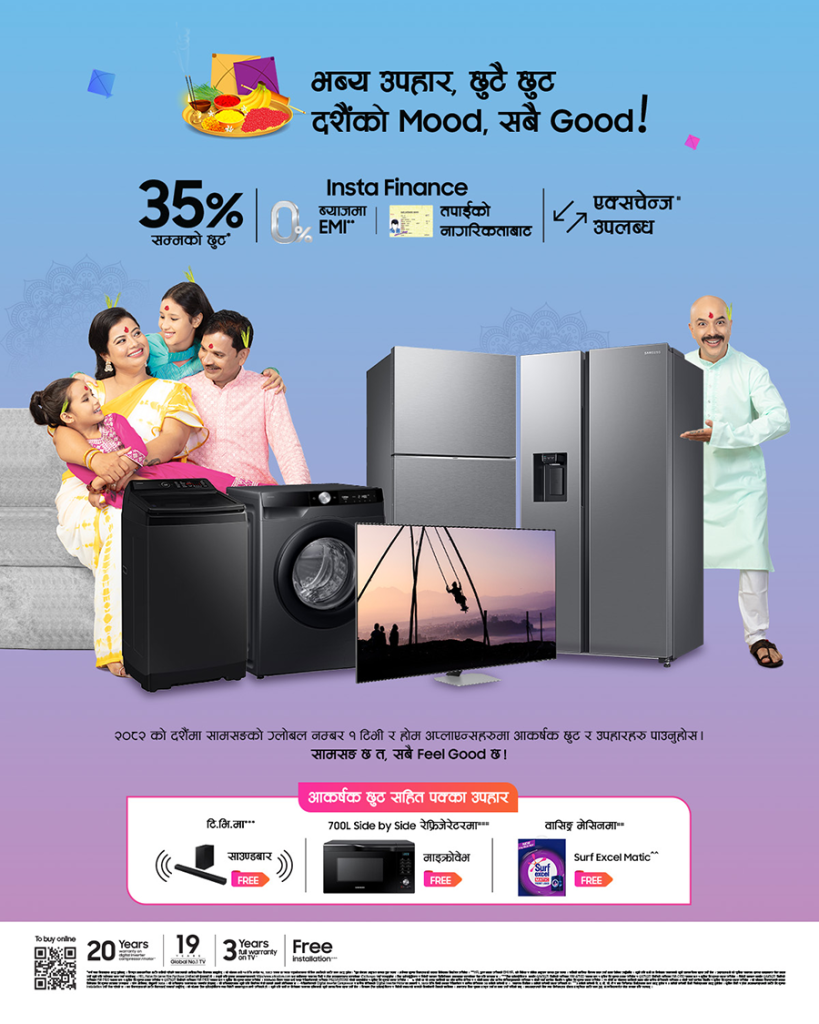२५ भदौदेखि २४ असोजसम्म लागु हुने यो योजना अन्तर्गत सामसङ टीभी, रेफ्रिजिरेटर र वासिङ मेसिनमा विशेष छुट र आकर्षक उपहार उपलब्ध हुने कम्पनीले जनाएको छ ।