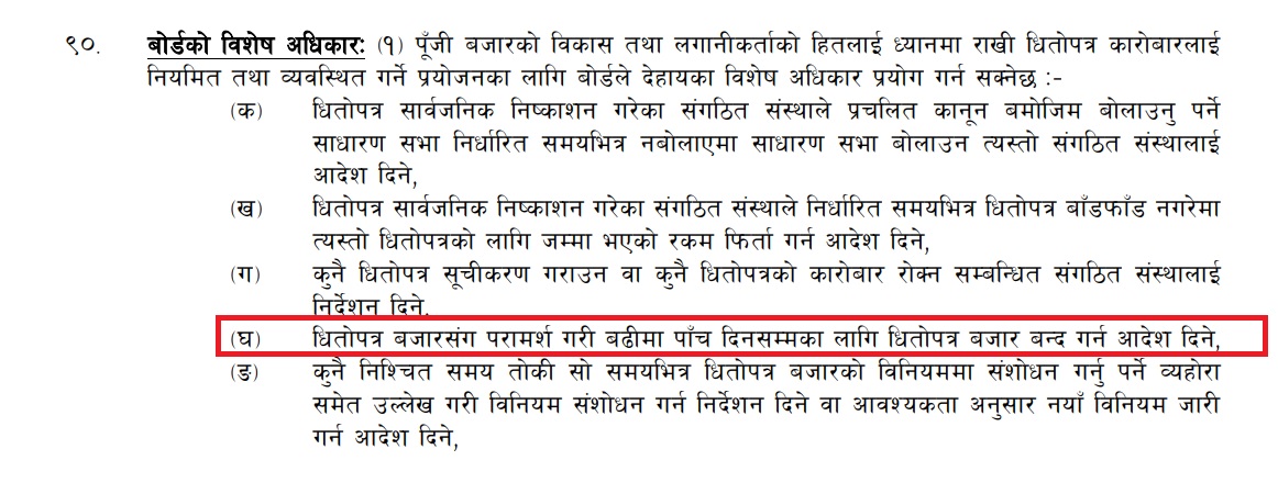 ऐनको दफा ९० मा बोर्डको विशेष अधिकार समेटिएको छ । सोअन्तर्गत बुँदा नम्बर घ मा धितोपत्र बजारसँग परामर्श गरी बढीमा ५ दिनसम्म धितोपत्र बजार बन्द गर्न आदेश दिने व्यवस्था छ । यो व्यवस्थाअनुसार अधिकतम ५ दिन बजार बन्द गर्न सकिन्छ ।