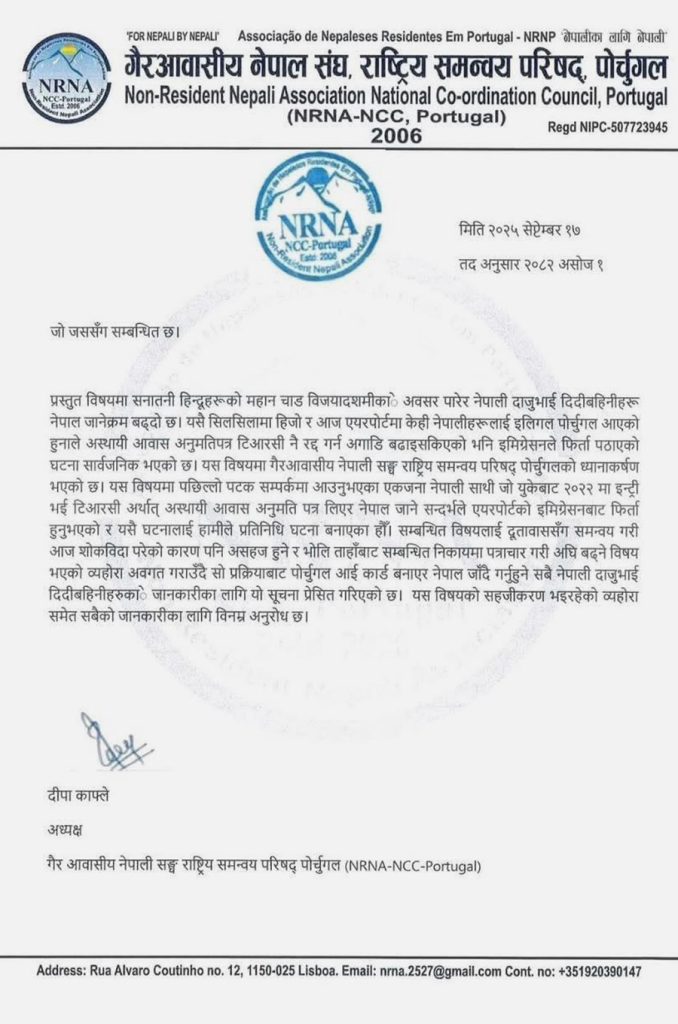 दशैंका लागि नेपाल फर्कन लागेका र आजभोलिमै जाने तयारीमा रहेका सयौं नेपालीहरुमा यो खबरले त्रास फैलियो । धेरैले यसलाई ‘फेक न्युज’भनेर पन्छाइरहेको समयमा गैरआवासीय नेपाल संघ राष्ट्रिय समन्वय परिषद् (एनआरएन–एनसीसी) पोर्चुगलले यस घटनाको पुष्टि गरेको छ ।