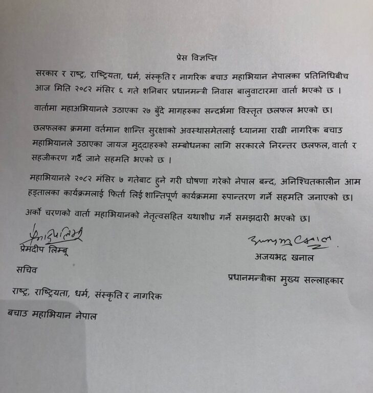 त्यस क्रममा अर्को चरणको वार्ता महाअभियानको नेतृत्वसहित यथाशीघ्र गर्ने समझदारी समेत भएको छ।