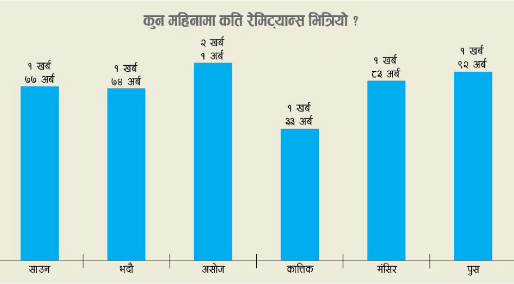 पुसमा मात्र १ खर्ब ९२ अर्ब ६२ करोड रुपैयाँ रेमिट्यान्स भित्रिएको राष्ट्र बैंकको पुससम्मको मासिक तथ्यांकले देखाएको छ । गत आर्थिक वर्षको पुसमा १ खर्ब २२ अर्ब ४४ करोड रुपैयाँ रेमिट्यान्स भित्रिएको थियो । मासिक रूपमा हेर्दा गत असोजमा हालसम्मकै धेरै २ खर्ब १ अर्ब रुपैयाँ रेमिट्यान्स मुलुक भित्रिएको थियो ।
