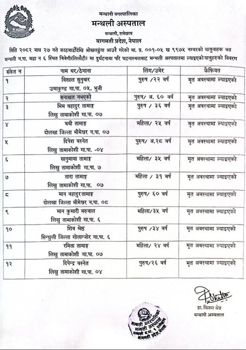 २८ माघ, काठमाडौँ। रामेछापको मन्थली नगरपालिका–६ स्थित तामाकोसी नदीमा मंगलबार बिहान बस खस्दा ज्यान गुमाएका १२ जनामध्ये ११ जनाको पहिचान खुलेको छ ।