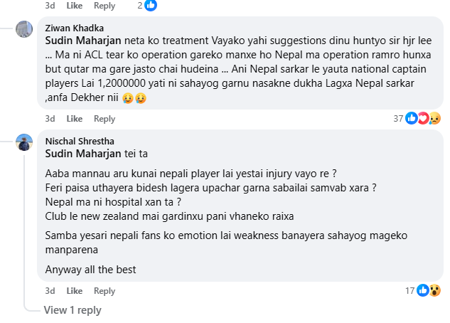 यसैबीच उनको पोस्टमा एक नेपाली फिजियोथेरापिस्ट सुदिन महर्जनले सुझाव दिँदै लेखे, ‘नेपालमै आएर सर्जरी गर्दा हुन्छ। हामीसँग पनि धेरै राम्रा सर्जन र फिजियो छन्।’