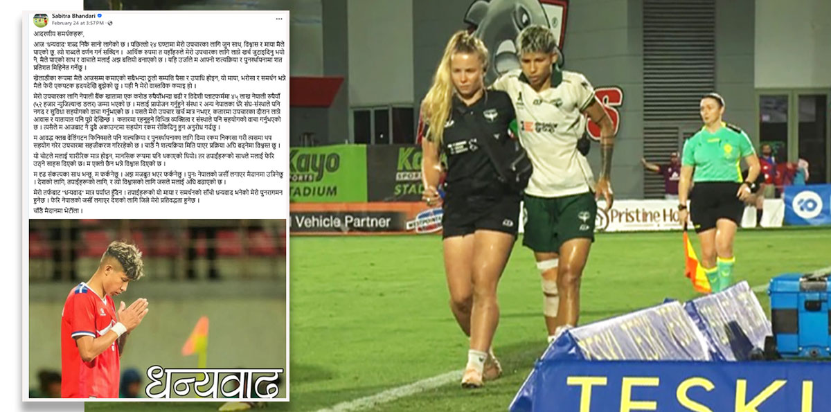 तर, यस पटक एन्फा नेतृत्वबाट वाचा गरेको सहयोग पनि पाइएन। चोट लागेको तीन सातापछिका लागि क्लबको पहलमा शल्यक्रिया मिति तोकिएको भए पनि एन्फाले आफ्ना तर्फबाट प्रयास गर्ने बतायो। तर, सोअनुसार एन्फाबाट प्रक्रिया अघि बढेन। मैले पटक पटक प्रयास गर्दा पनि उहाँहरूलाई सम्पर्क गर्न कठिन भयो। अघिल्लो साता एन्फा अध्यक्ष आफैँले मेरो उपचारमा एन्फाबाट प्रशासनिक सहयोग गर्न नसकिने जानकारी दिनुभयो। उहाँले नगद पाँच लाखसम्म सहयोग गर्ने र अन्य प्रक्रिया आफैँ गर्न भन्नुभयो। एक त मैले यसअघि चालेको प्रक्रिया रोकियो, अर्कातर्फ मैले झन्डै दुई महिनापछि मात्र शल्यक्रिया मितिका लागि फेरि प्रयास गर्नुपर्ने भएको छ।