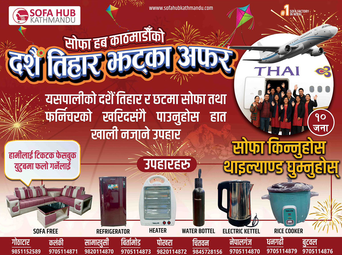 सोफा हब काठमाडौंले सुरु गर्यो ‘दशैँ–तिहार झटका अफर’, थाइल्यान्ड भ्रमणदेखि फ्रिजसम्म उपहार